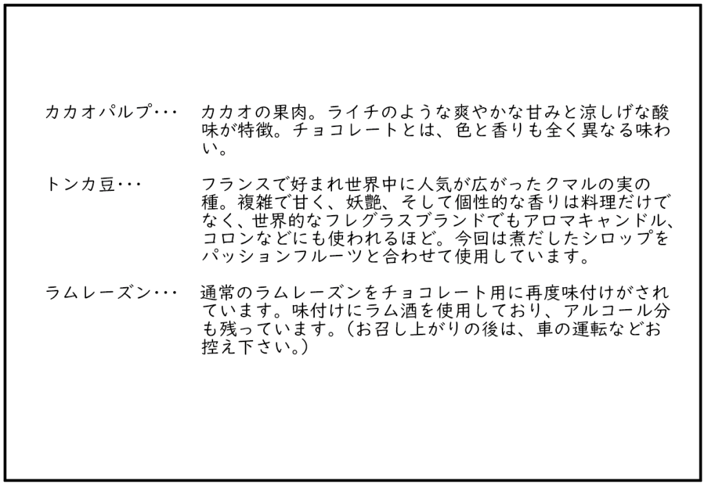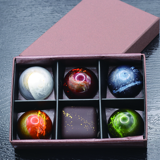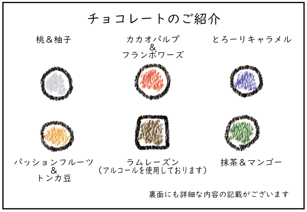 6種類のそれぞれの味に合わせ、使用するチョコレートも6種類以上とこだわりました。異なる味に合わせ、見た目も美しく仕上げました。カラフルなチョコレートの中には味の異なるガナッシュが入っております。(一部アルコールを使用している味がございます。)