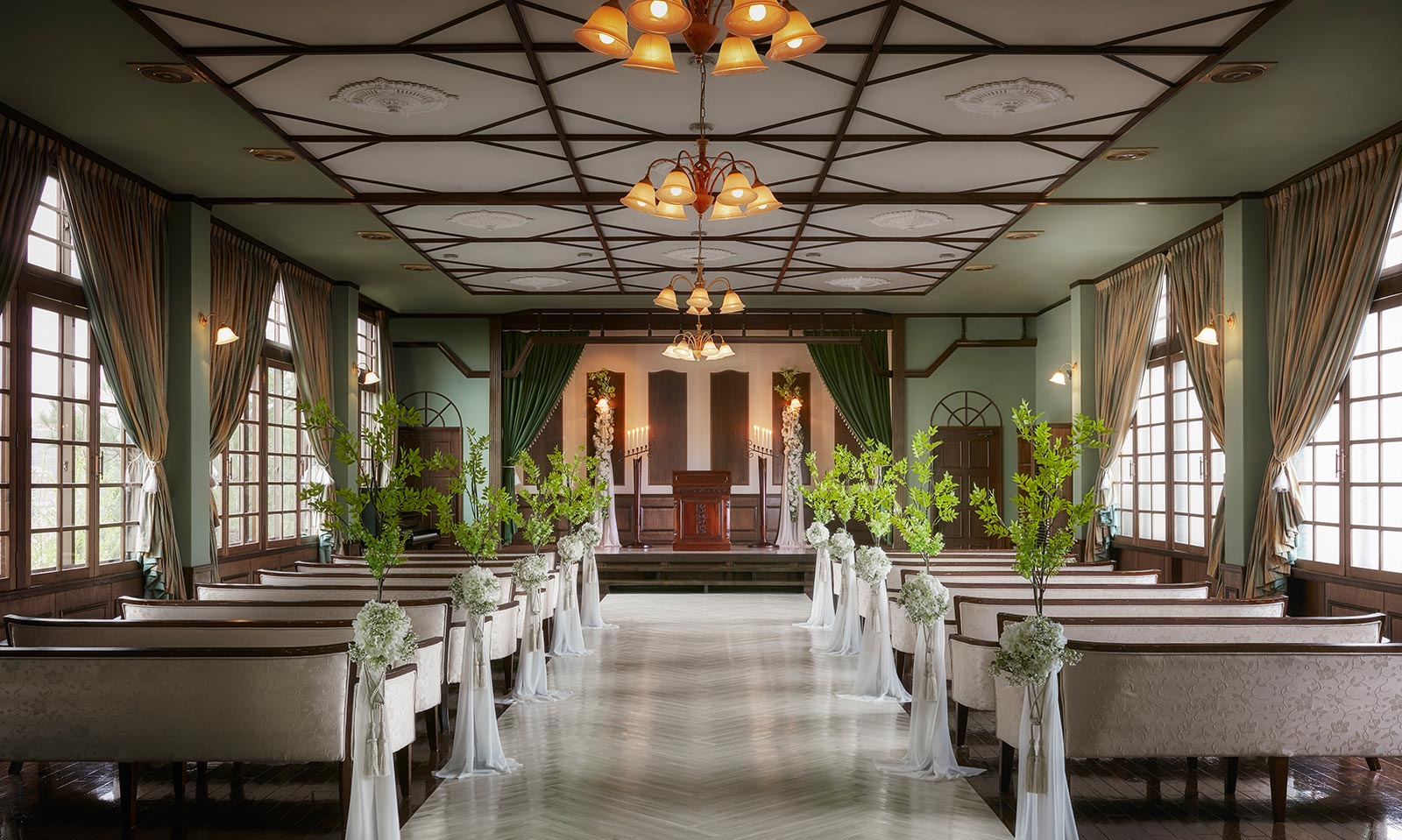 天井装飾や照明、列席者用の長椅子すべてがハーモニーとなって美しさを生み出しています。
