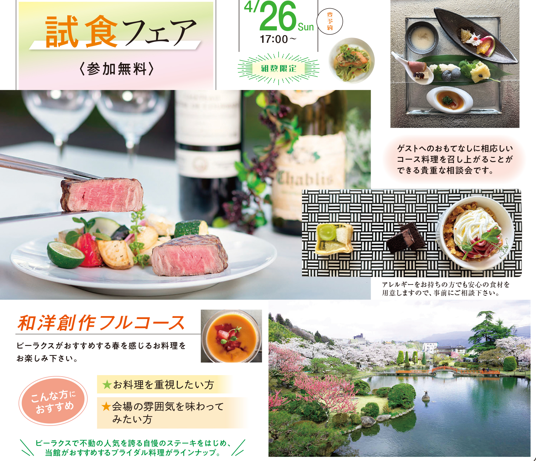 ゲストへの『おもてなし』の1番は料理‼️そんな方におすすめのフェアです。またビーラクスの会場の雰囲気を味わってみたい方も◎