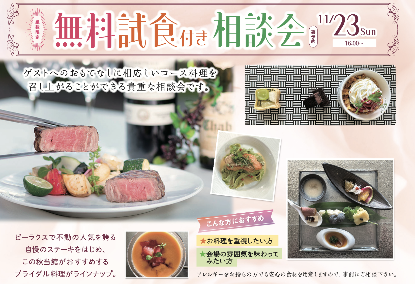 ゲストへの『おもてなし』の1番は料理‼️そんな方におすすめのフェアです。またビーラクスの会場の雰囲気を味わってみたい方も◎